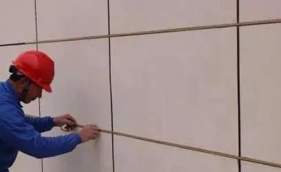 膩子施工完,涂刷抗堿封閉底漆后,可進行分格縫工序。根據(jù)設(shè)計的分格大小,用彈線的方式在墻面上畫分格。