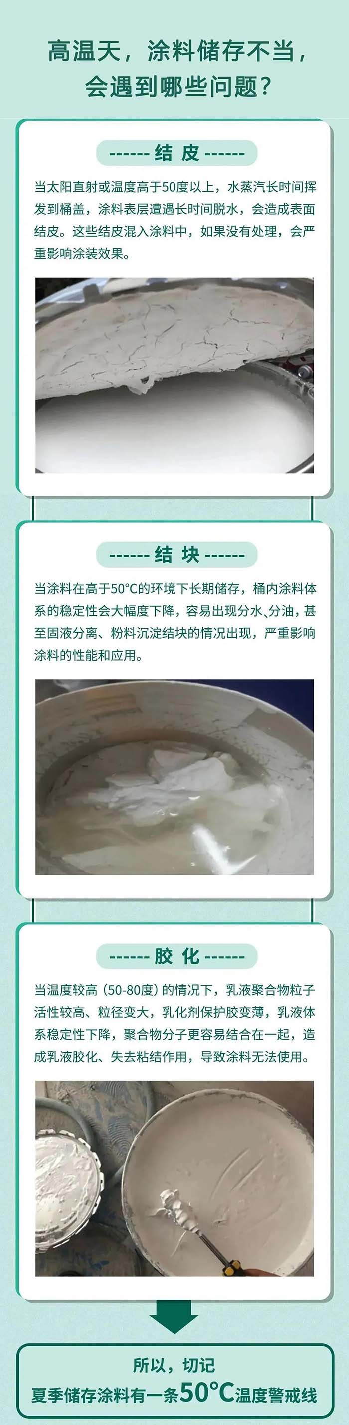 夏天的高溫天氣即將到來。水性涂料在高溫環(huán)境下儲存,或者遭遇長時間的太陽直曬,會導(dǎo)致桶身和桶蓋金屬材質(zhì)溫度迅速升高,使得與其接觸的涂料,特別是表層涂料出現(xiàn)結(jié)皮、結(jié)塊、膠化等現(xiàn)象,影響涂料的正常使用。