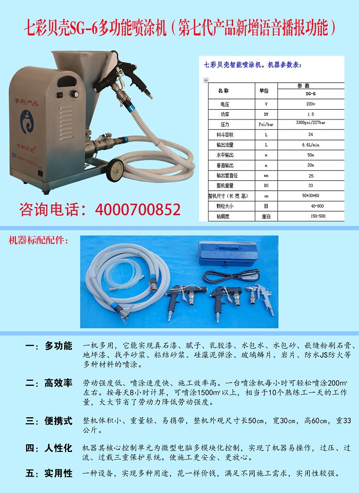 一機多用,它能實現(xiàn)真石漆、質感、膩子、粉刷石膏、乳膠漆、底漆、油漆、地坪漆、找平砂漿、粘結砂漿、掛網(wǎng)砂漿、硅藻泥、彈涂、玻璃鱗片、巖片、防水JS防火、保溫材料、單組份聚氨酯等十多種材料的噴涂。噴涂厚度為1-10mm(也可以根據(jù)噴槍走的快慢來調整噴涂厚度)噴射寬度30-50CM。