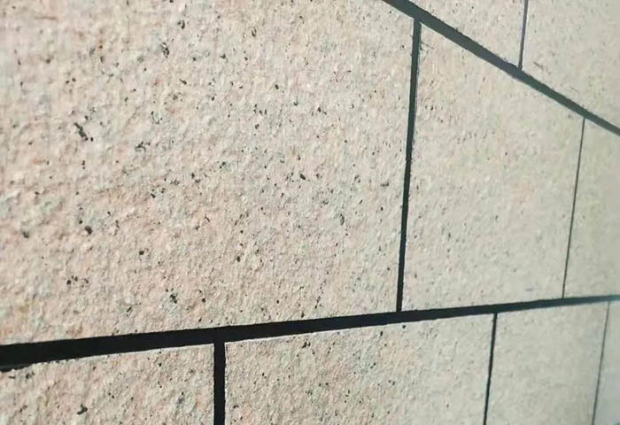 原因:仿石漆中涂干燥后,漆膜較厚,柔韌性較高,在撕除美紋紙時,破壞了仿石漆膜的完整性,熱漲伸縮時,漆膜與膩子層的伸縮比差異較大,導(dǎo)致出現(xiàn)分格線邊緣開始翹起分層。
